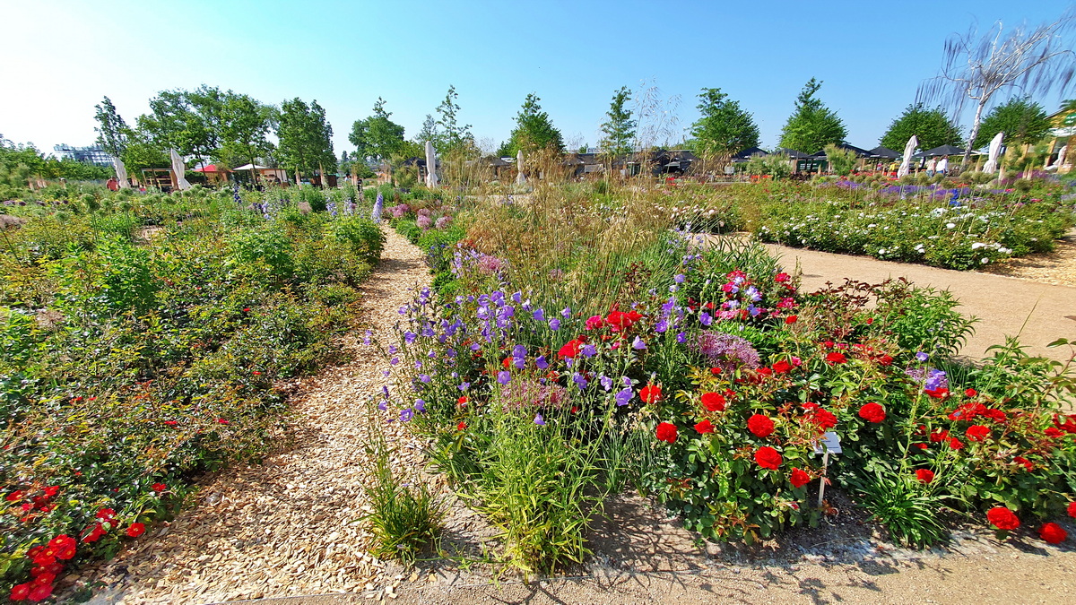 Auf dem Experimentierfeld sind Stauden und Rosen in großer Vielfalt bunt durcheinander gepflanzt.