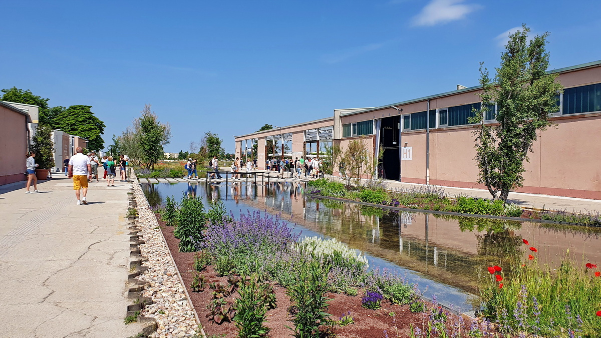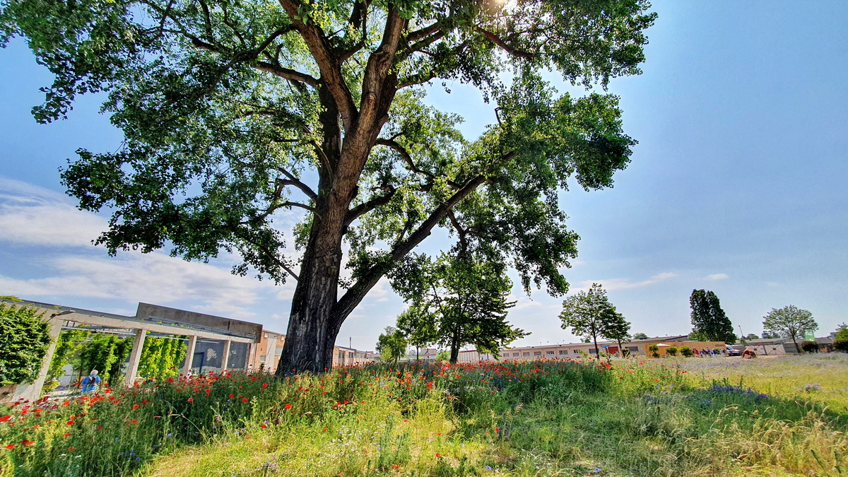 Drum herum gibt es Flächen, auf denen der Bauschutt der entfernten Gebäude recycelt und mit trockenheitsverträglichen Stauden, wie z.B. Federgras, bepflanzt wurden.