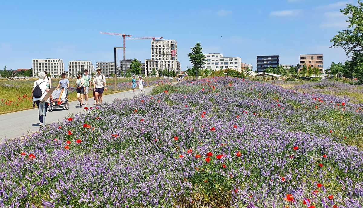 Vor dem Eingang zum Park wurde ein neues Wohngebiet (in Mannheim heißt das Quartier) mit mehreren Wohn- und Gewerbe-Gebäuden errichtet, die verschiedene Methoden der Nachhaltigkeit austesten.