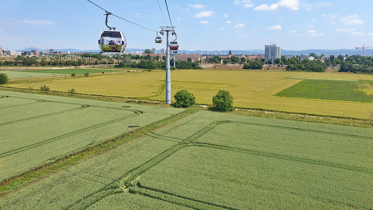 Von hier wandern wir zur Seilbahn und schweben in ein paar genussvollen Minuten über den Neckar und die Kleingartenanlagen.
