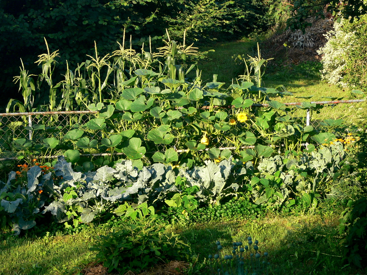 Da ist das helle grün der Buschbohnen, dahinter der dunklere Rahmen durch Kürbis und Mais und dazwischen das auffällige Blaugrün des Kohls.