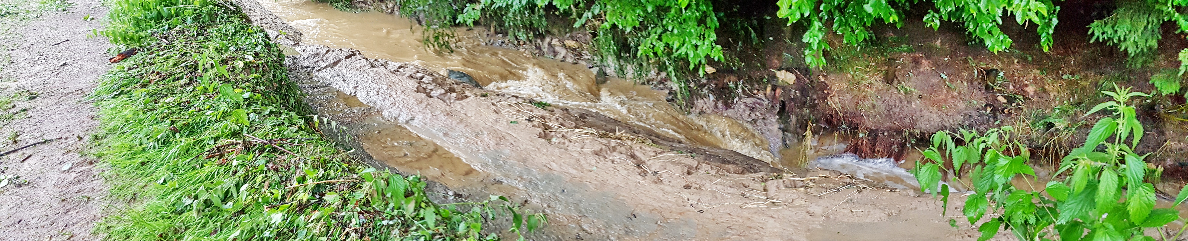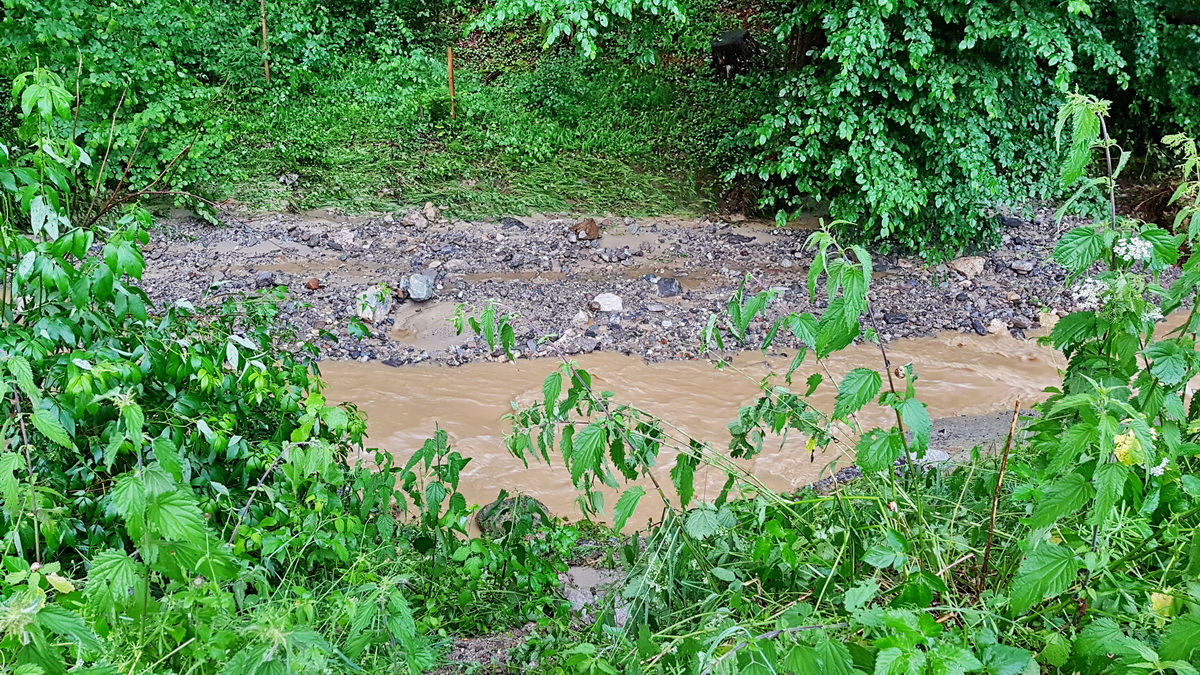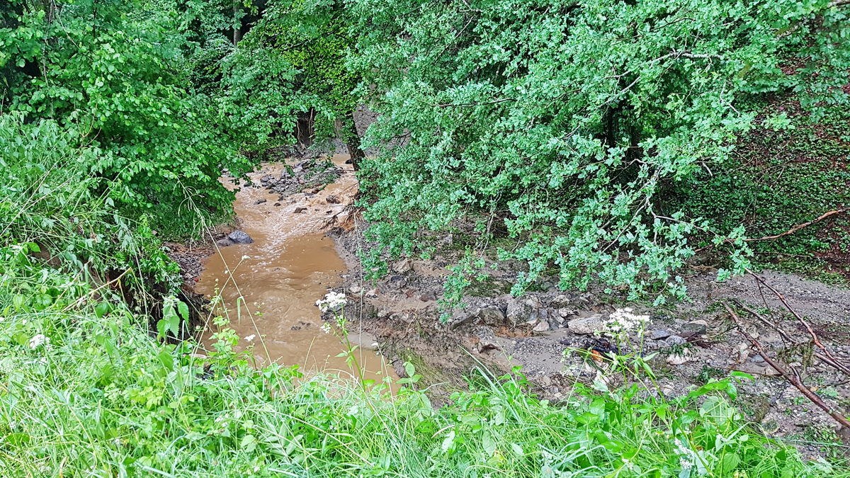 Wir liegen zum Glück 60 Höhenmeter über dem Bach, den man normalerweise trockenen Fußes überschreiten kann.
