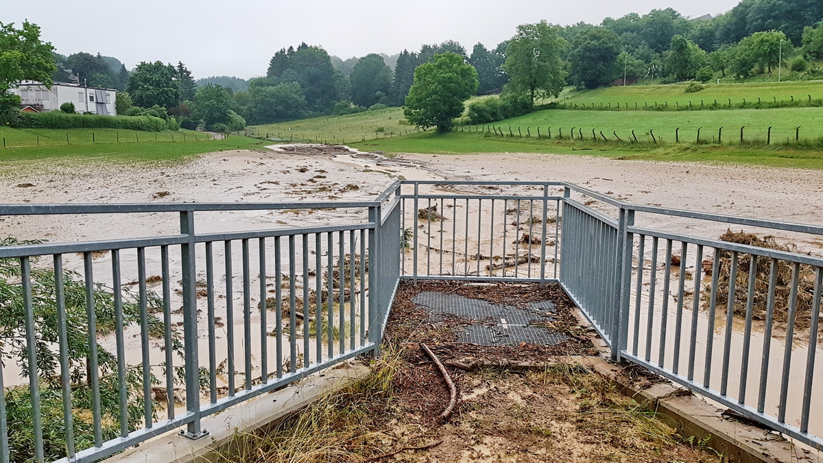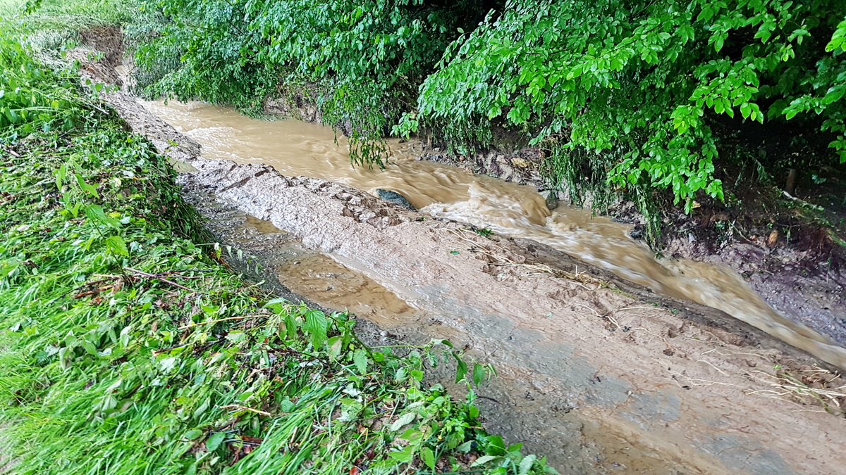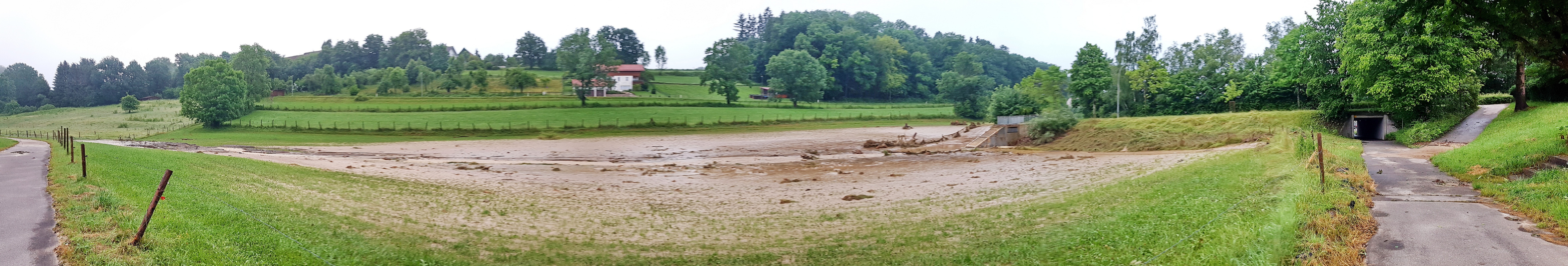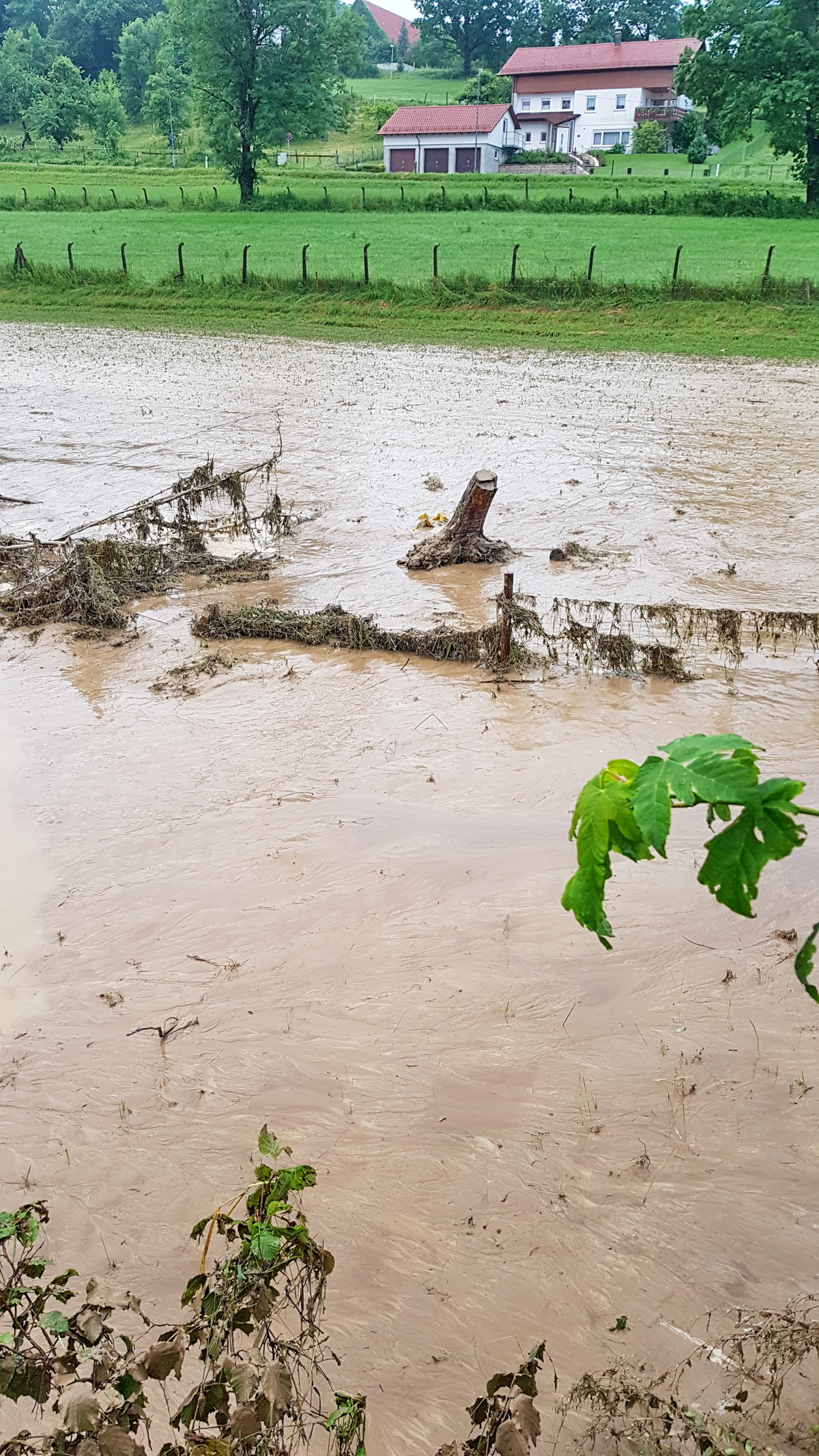Wir liegen zum Glück 60 Höhenmeter über dem Bach, den man normalerweise trockenen Fußes überschreiten kann.