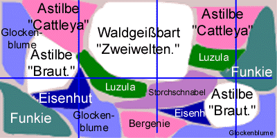 Jetzt wird ein genauer Plan erstellt, aus dem die genauen Stückzahlen der Pflanzen hervorgehen:Der Detailplan wird mit einer Legende versehen, aus der die genaue Bezeichnung der Pflanzenarten und Sorten sowie der Mengenbedarf hervorgeht. Die Verwendung botanischer Pflanzennamen ermöglicht eindeutige Bestellungen bei den Lieferanten !